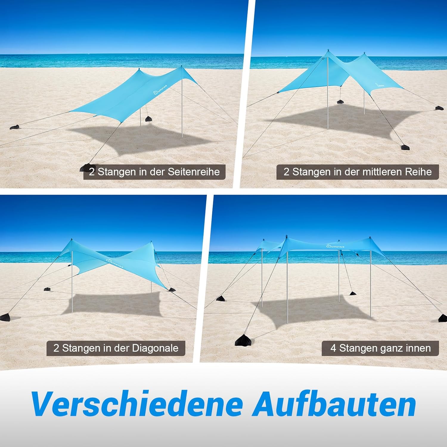 Просторное укрытие для всей семьи: Пляжная палатка доступна в двух размерах: большой (2,30 x 2,30 м) для 2-6 человек С высотой столбов в 2 метра вы сможете увеличить площадь тени на 50%, что идеально подходит для семейных и дружеских встреч на свежем воздухе.